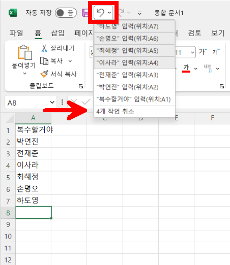 이 버튼의 오른쪽에 있는 아래 화살표를 누르면 실행했던 작업들이 순서대로 저장되어 있는 목록이 나타납니다. 여기에서 돌아가고 싶은 특정 작업을 선택하면 한 번에 여러 개의 작업을 취소할 수 있습니다.