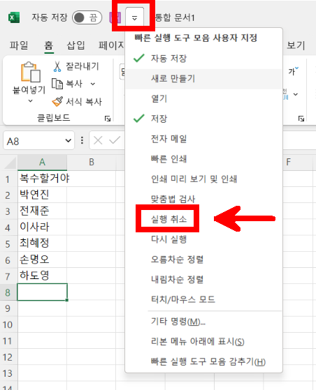 빠른 실행 도구 모음 사용자 지정을 클릭하고 목록에서 [실행 취소]를 선택하면 도구 모음에 추가됩니다.