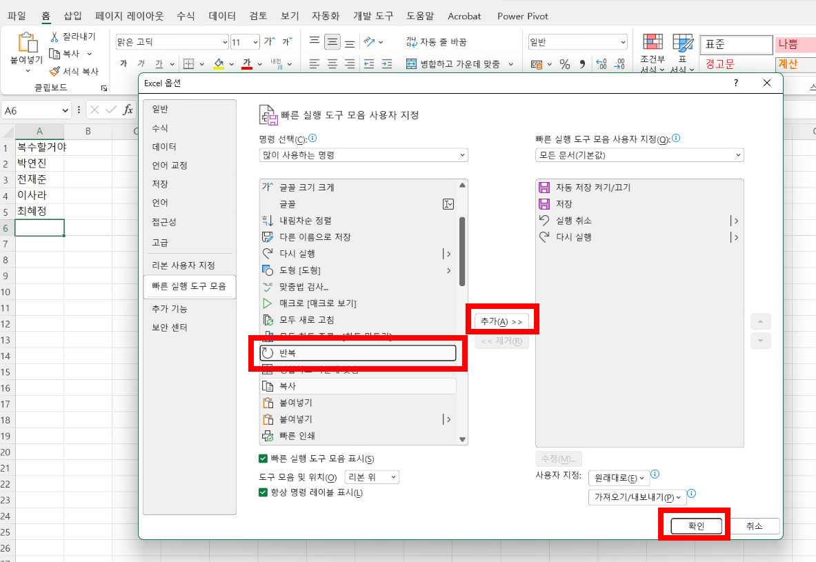 [반복] 기능은 기본적으로는 빠른 실행 도구 모음에 없어서 추가 해야 합니다. 빠른 실행 도구 모음 사용자 지정에서 [반복] 기능을 추가하면 빠른 실행 도구 모음에서 사용할 수 있습니다.
